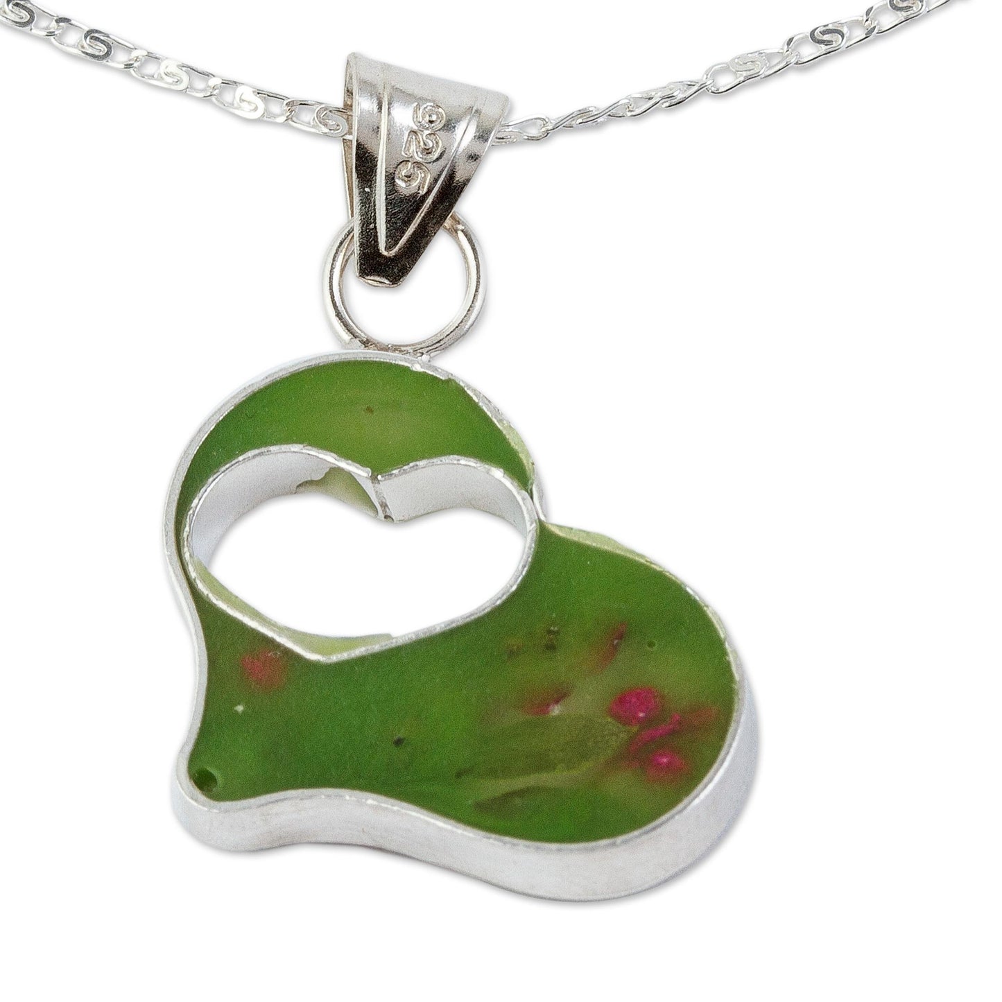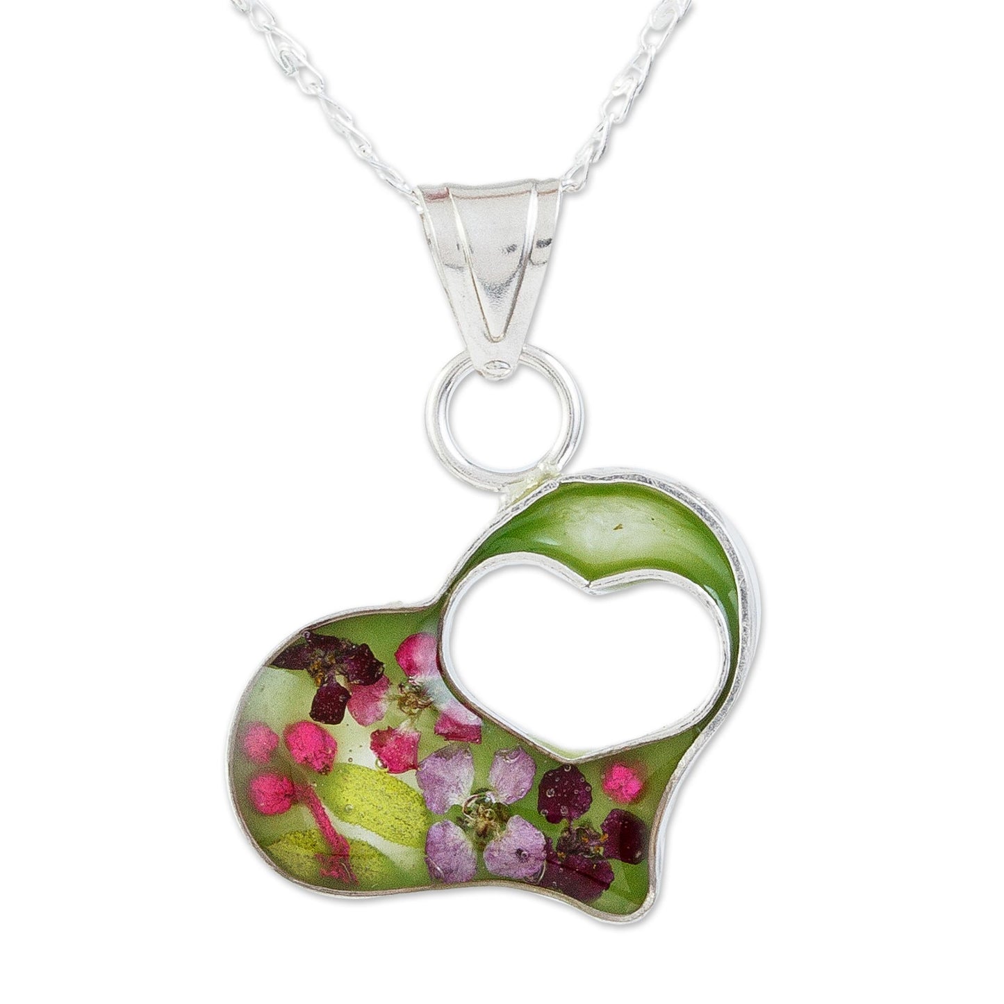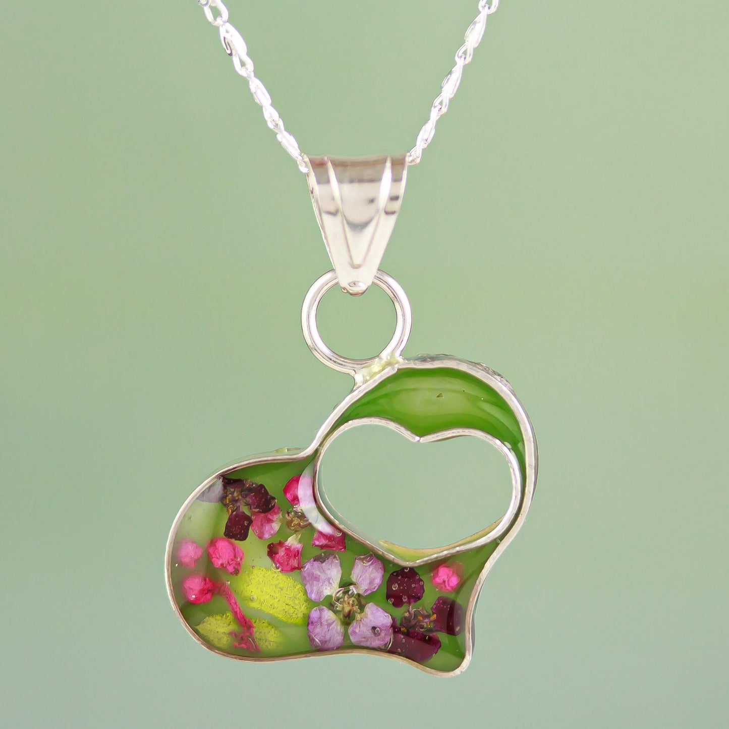 Green Flowered Heart Double Heart Sterling Silver and Resin Pendant Necklace