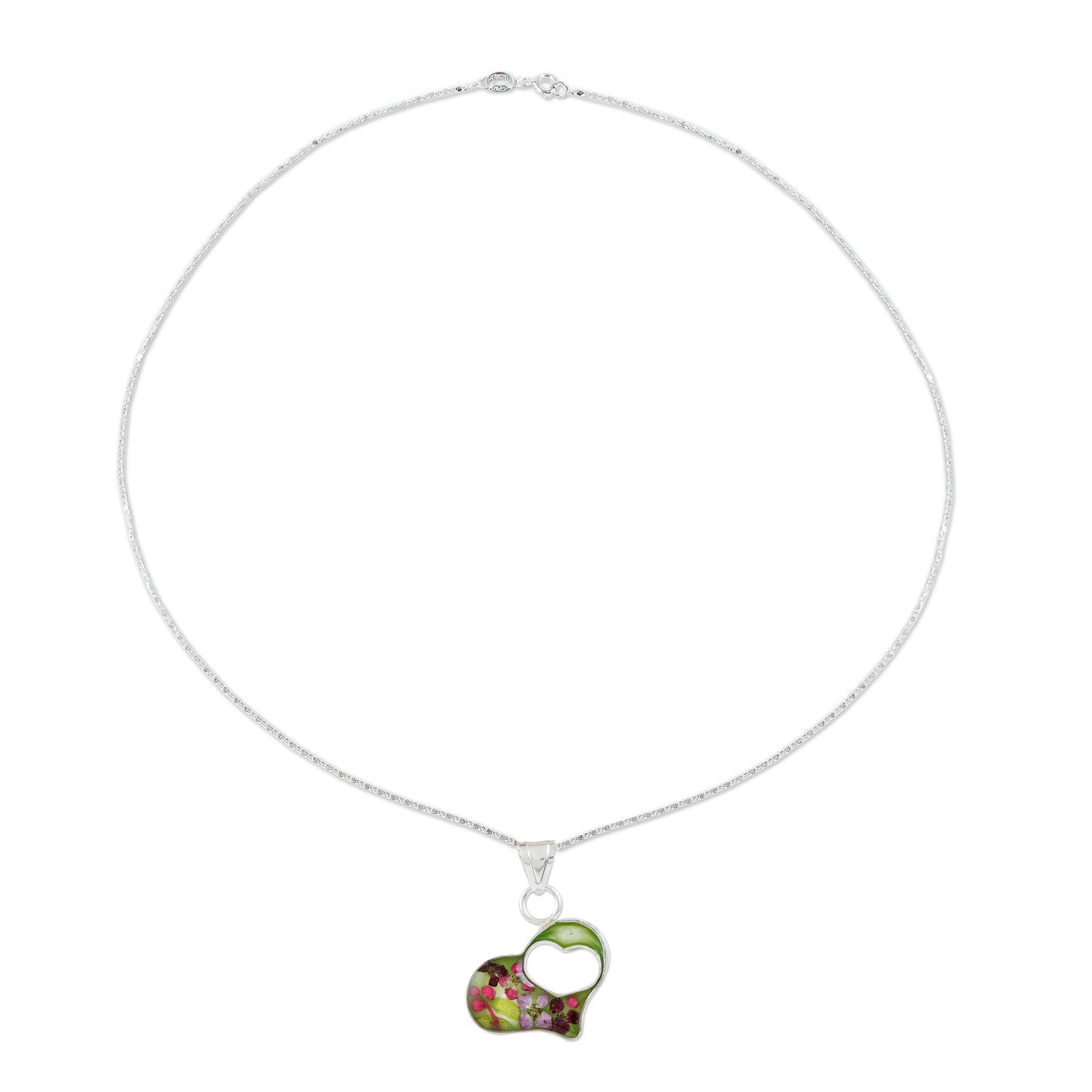 We all know someone who is emotionally in tune with plants, and it just might be you. The Del Toro Family creates this sterling silver chain and pendant necklace. It features dried flowers preserved in resin in a double heart design for that special person.