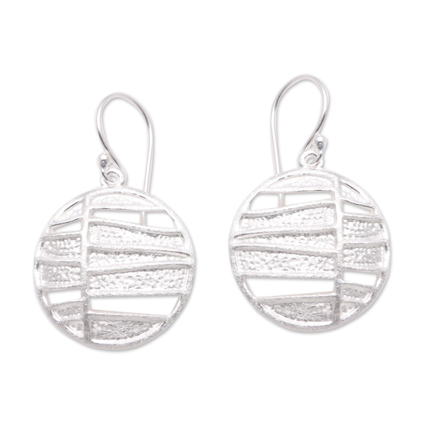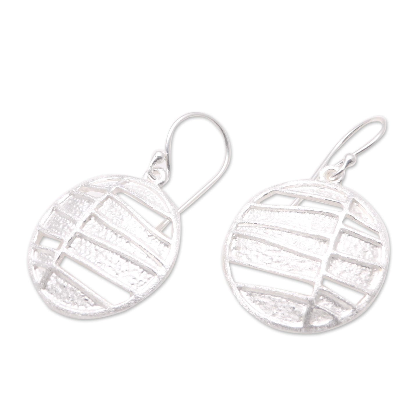 Intriguing and beautiful, these modern dangle earrings are created by Desi Antari in Bali. She crafts these circular earrings from sterling silver, filled with abstract patterns and openwork that is accentuated by a brushed-satin finish.