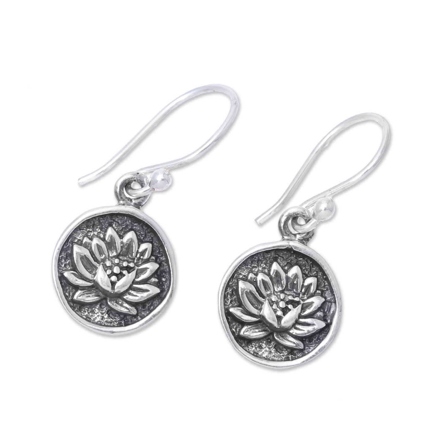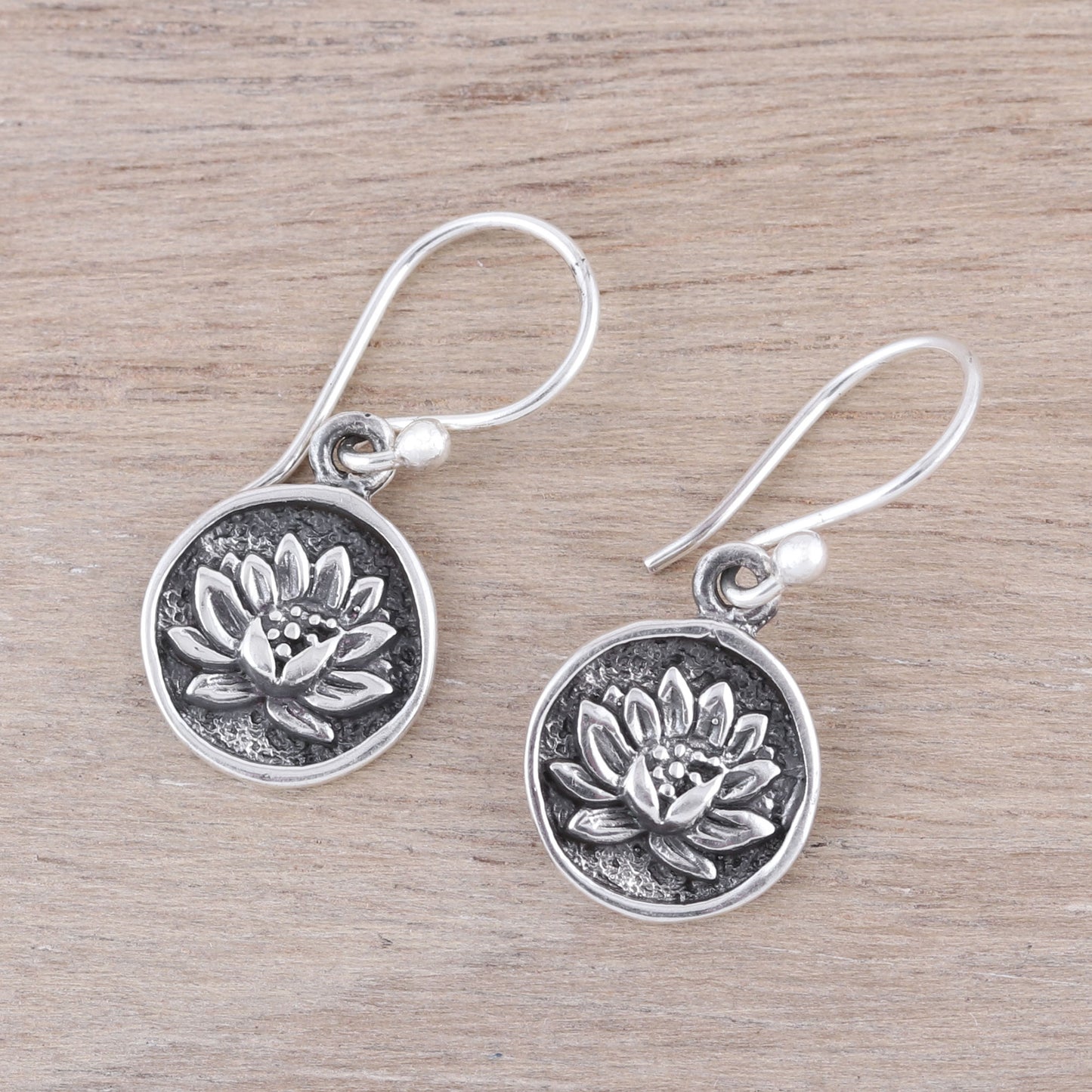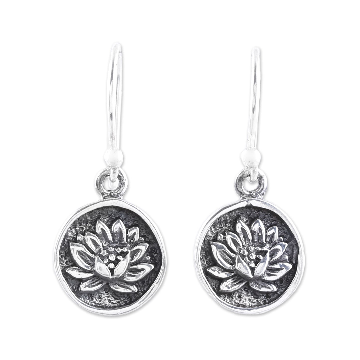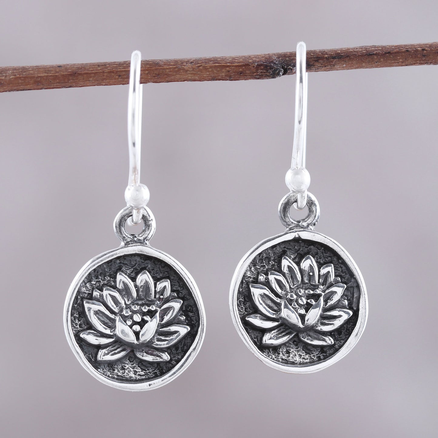 Lotus Bliss Lotus Motif Sterling Silver Dangle Earrings from India