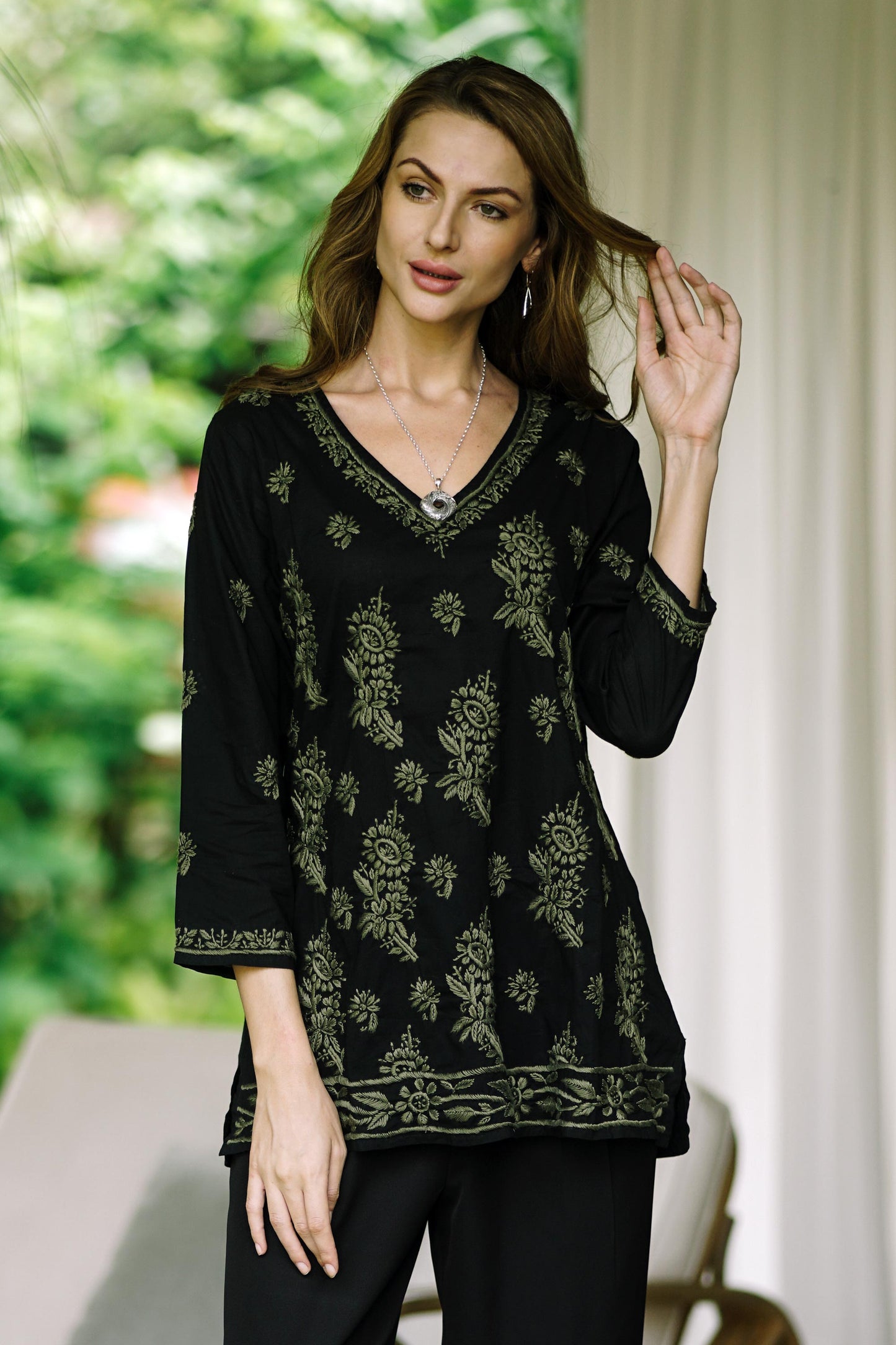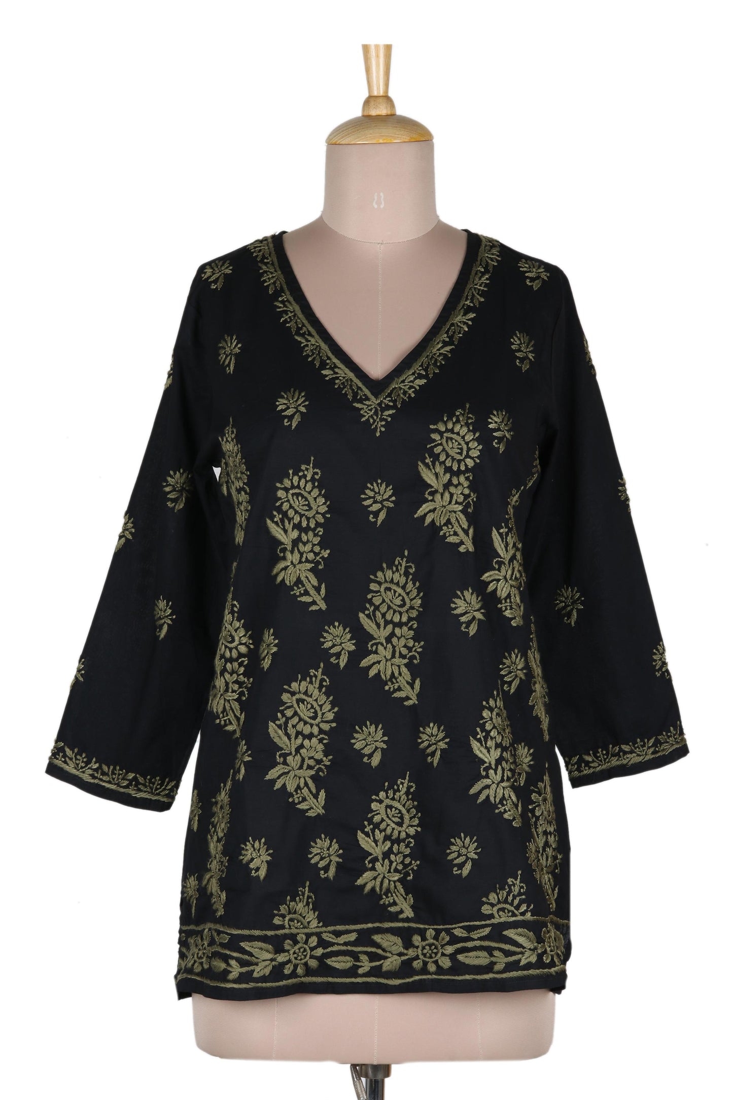 India's Shalabh designs this 100% cotton tunic featuring a V neck, long sleeves, and lateral slits for comfort and freedom of movement. Traditional chikankari hand embroidery in olive green is used to create intricate flowers, buds, and leaves across the field of jet black fabric to create this wardrobe staple, which pairs with just about anything.