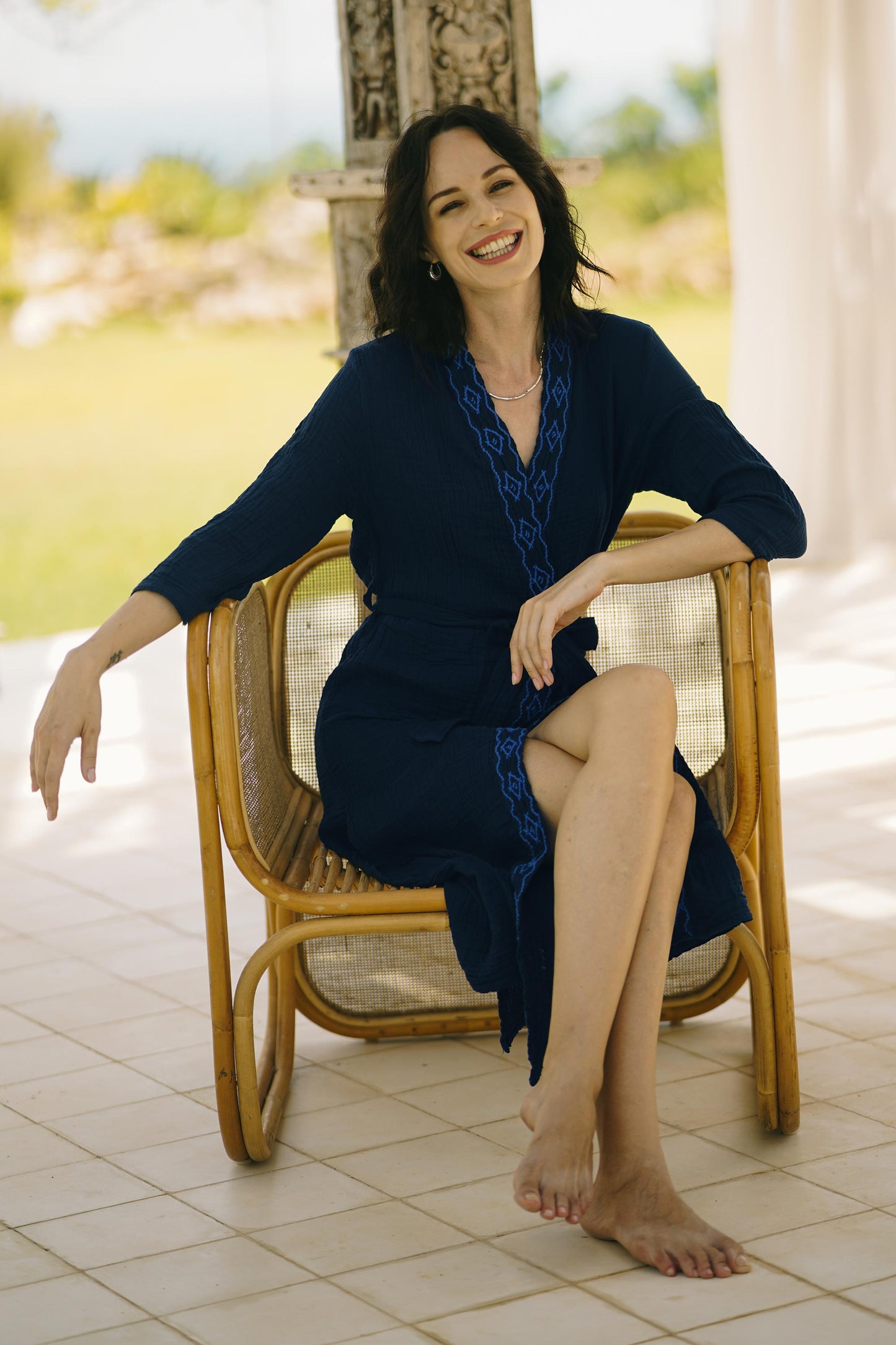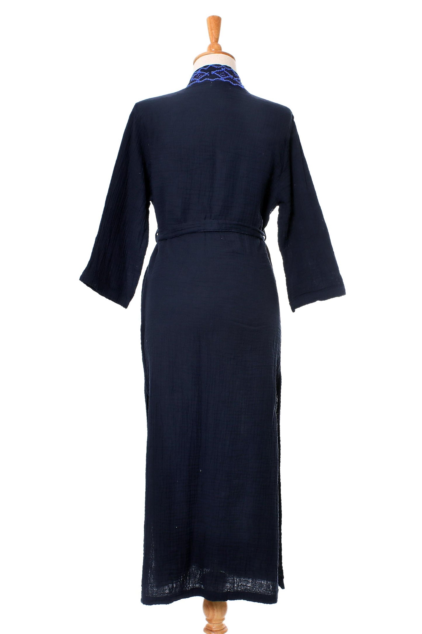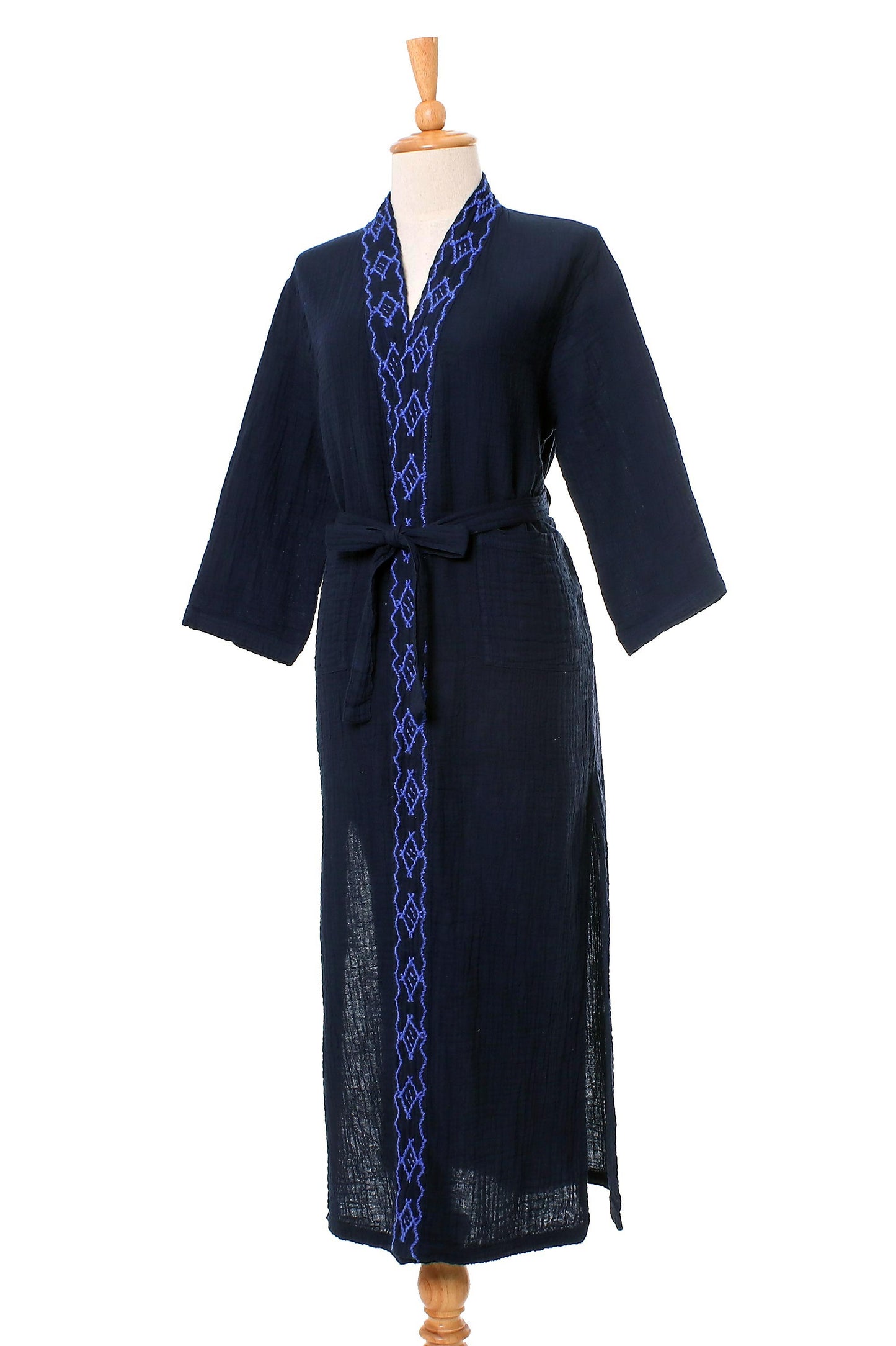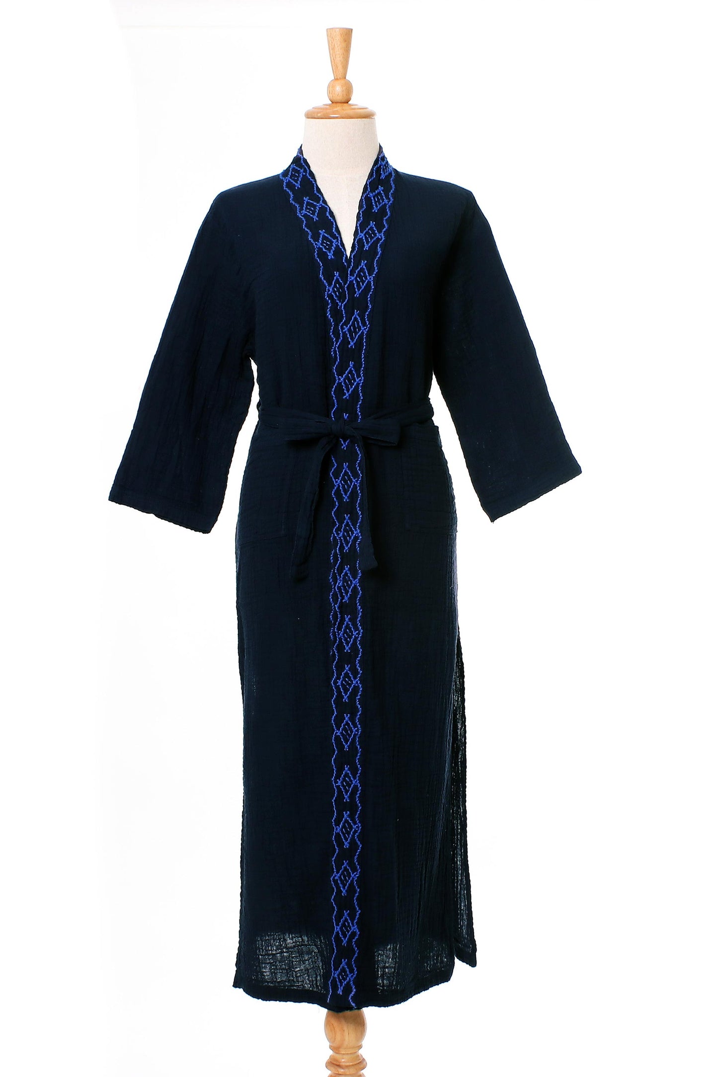 Midnight Relaxation Diamond Embroidered Cotton Robe in Midnight from Thailand