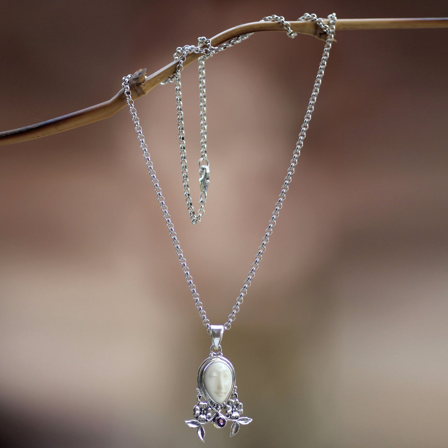 Appearing in white, Mother Earth rests on a bed of sterling silver jasmines. They are bathed by an amethyst dewdrop in the exclusive design by Buana. The necklace is crafted by hand featuring a cow bone pendant.