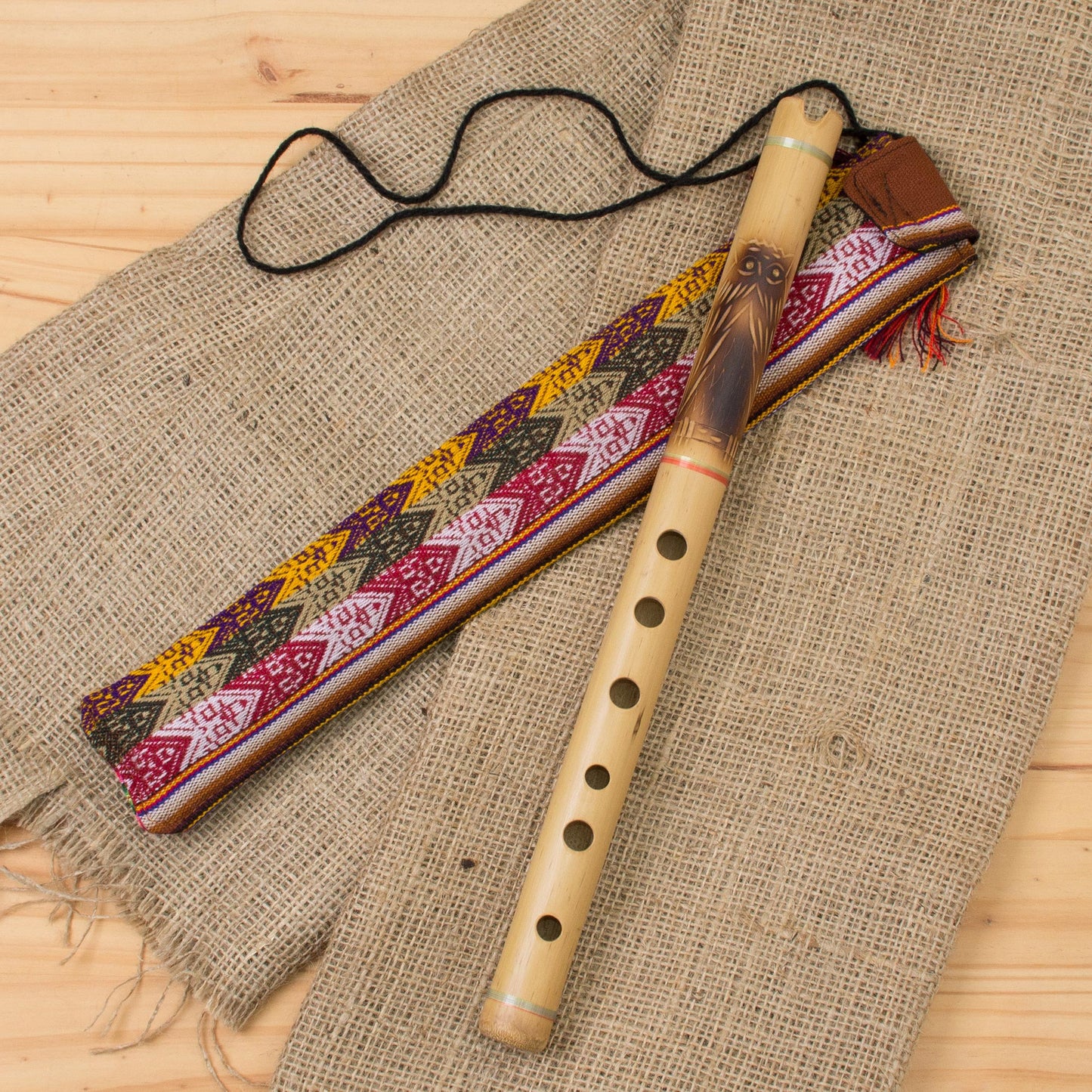 Handcrafted of smooth bamboo, the quena flute is a legacy of the Inca. Today it is an indispensable instrument in traditional Peruvian songs. Benito Tito perforates holes of different widths to ensure a professional sound. An owl adorns the flute and its fabric case emulates pre-Hispanic textiles.