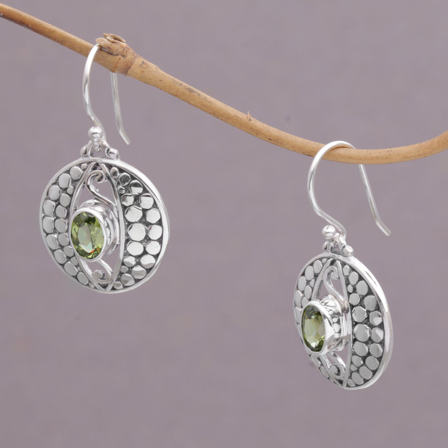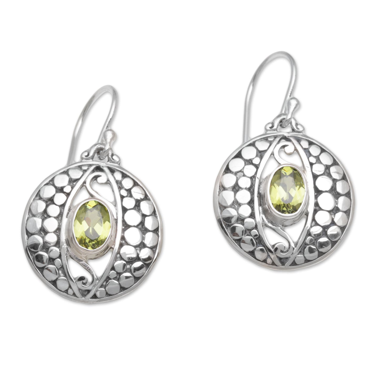 Oval peridot stones totaling over one carat are featured in this pair of dangle earrings from Bali. Each stone is surrounded by handcrafted dot motifs in sterling silver that take the shape of an eye. Designed by Wirabhuwana, these elegant earrings are given a striking combination of finishes.