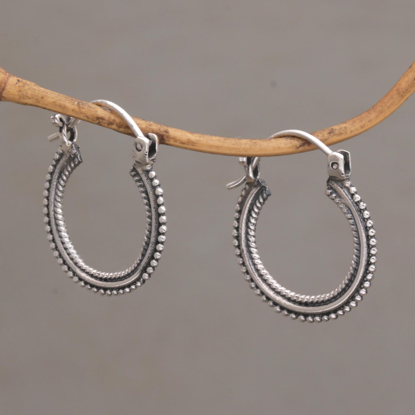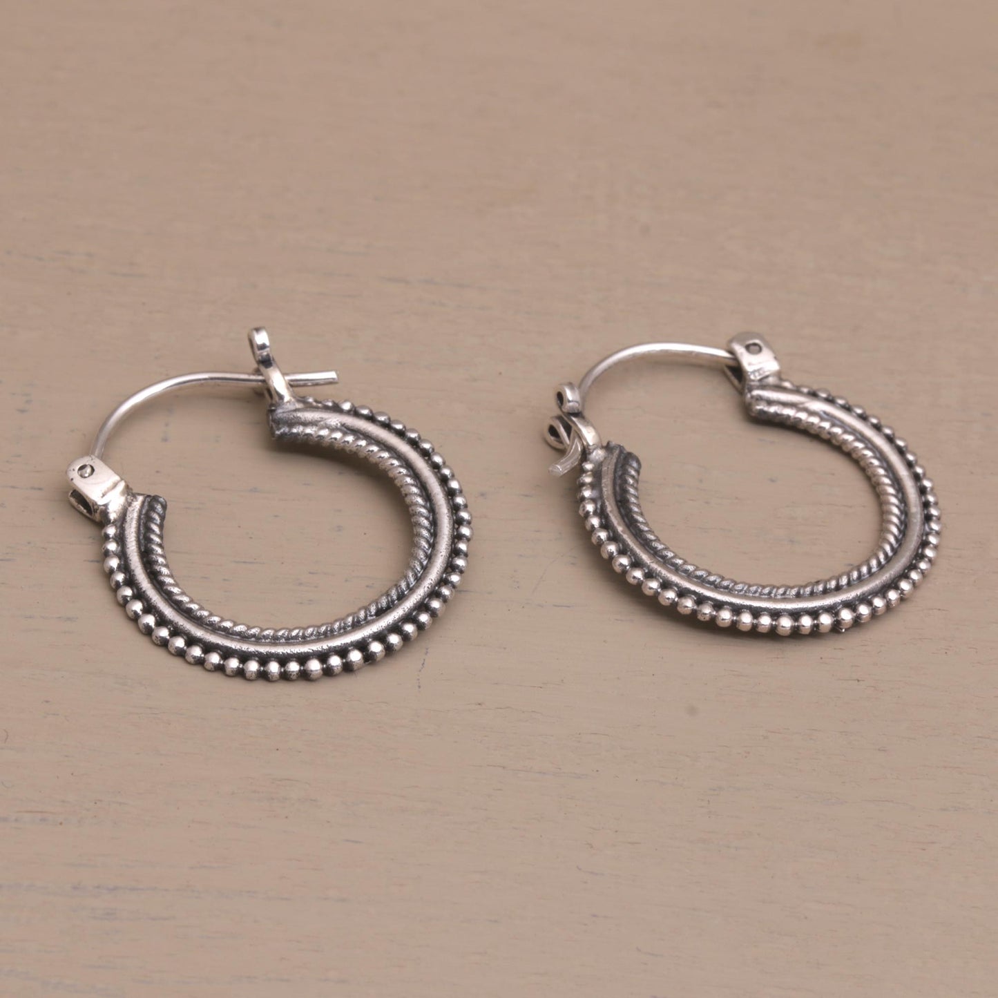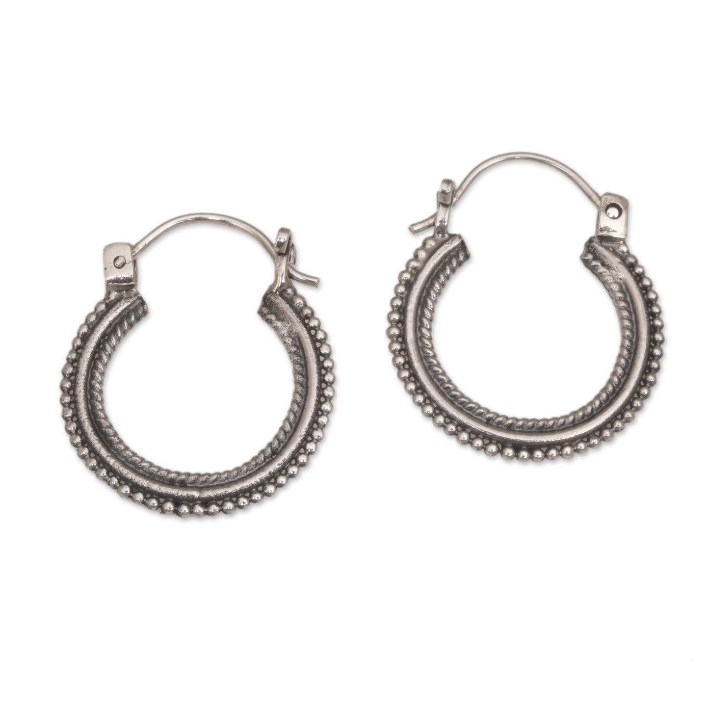 Versatile and stylish, these are earrings you can where anywhere. The hoop earrings are crafted from sterling silver and feature beaded textures on the outside of the hoop and rope-like motifs on the inside of the hoop. Oxidizing adds depth to the design, which is the work of Bali's Rupadana.