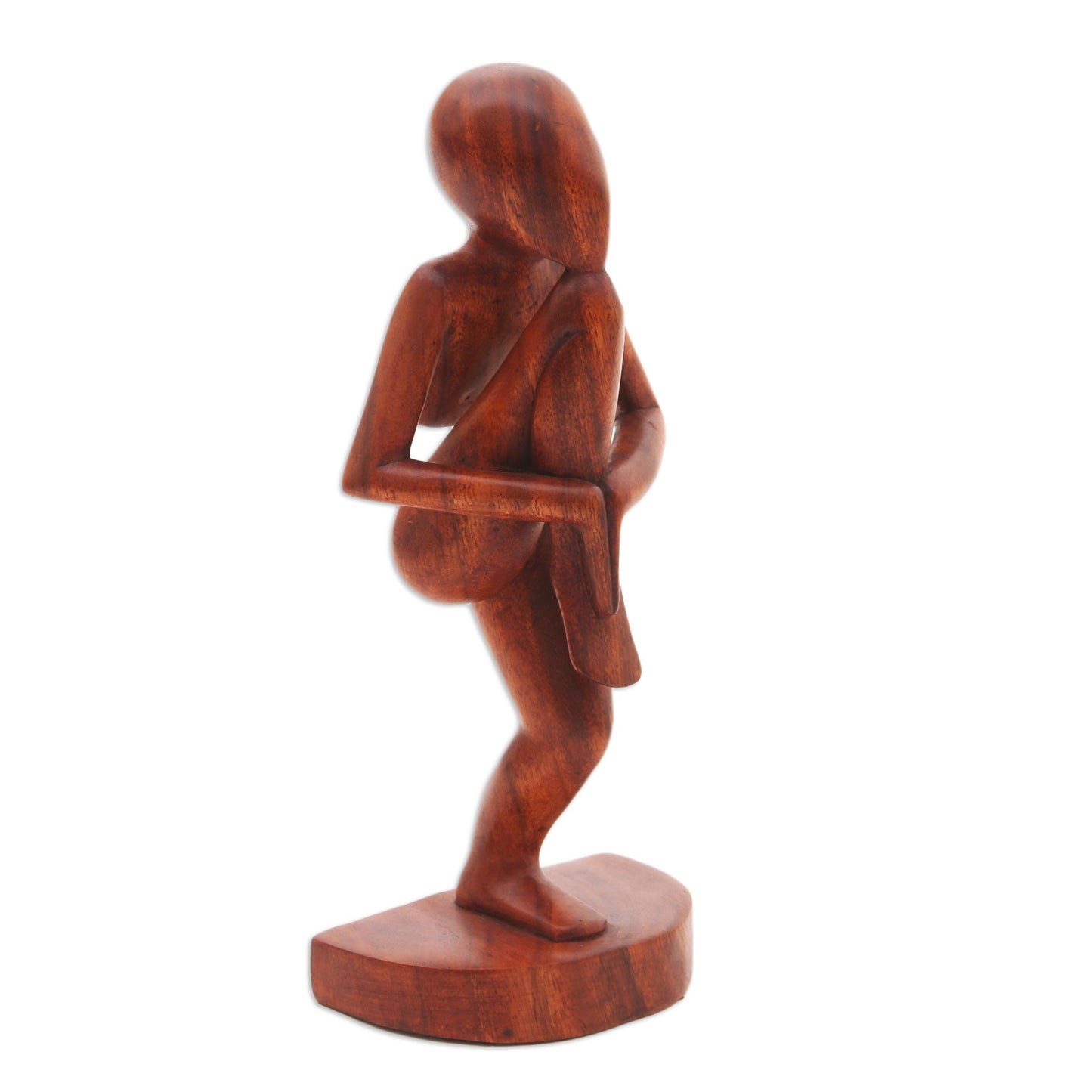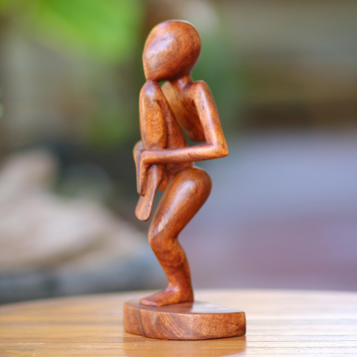This Yogi's presence inspires inner peace. A Yogi exerts great self-control as he stands on one leg while he rests his chin on his raised knee. Wayan Rendah carves his image form a single block of suar wood, leaving an empty space where his back should be. Yogis are much admired people who roam the countryside in search of purification and knowledge through the practice of yoga, meditation, ecstatic trances and frightening self-mortification.