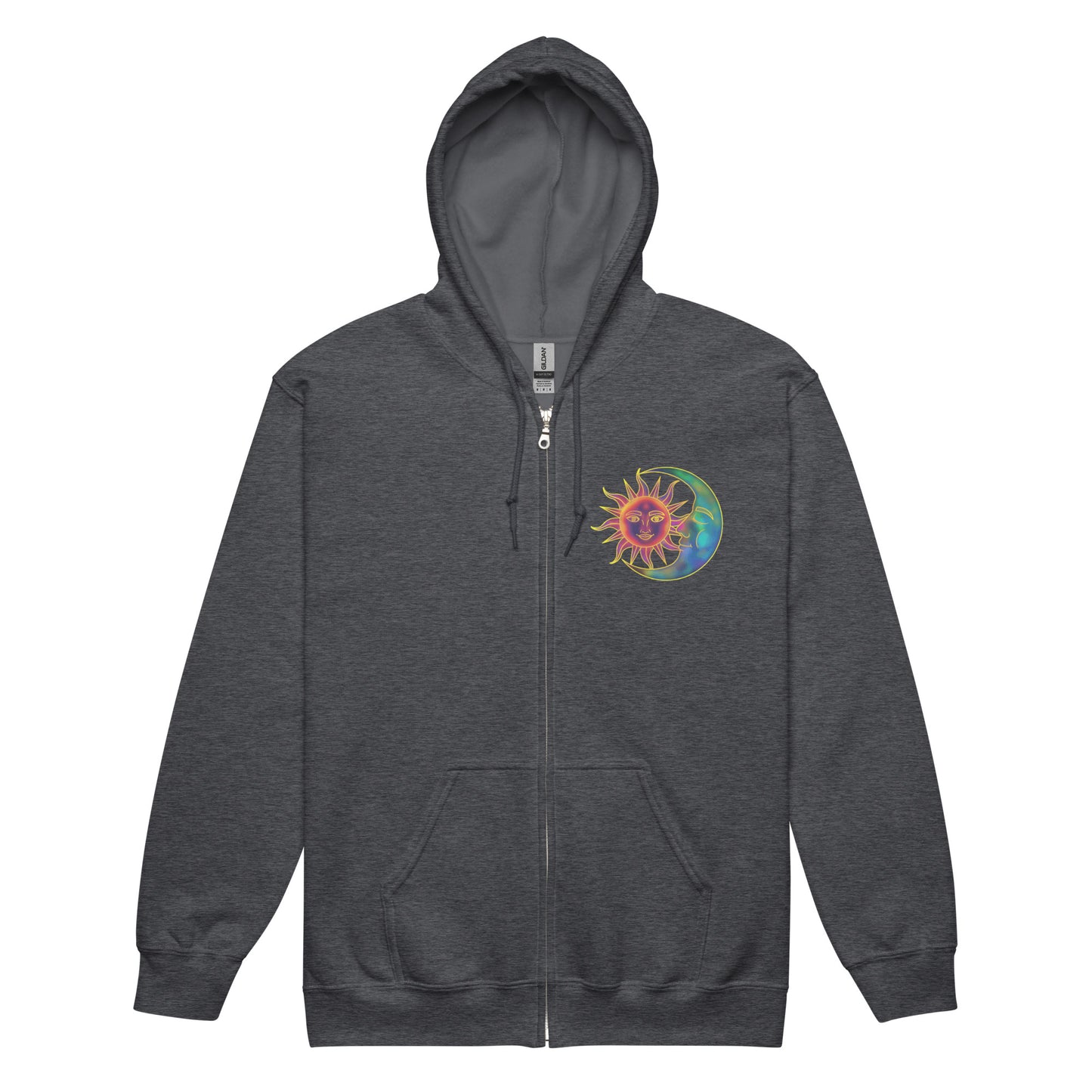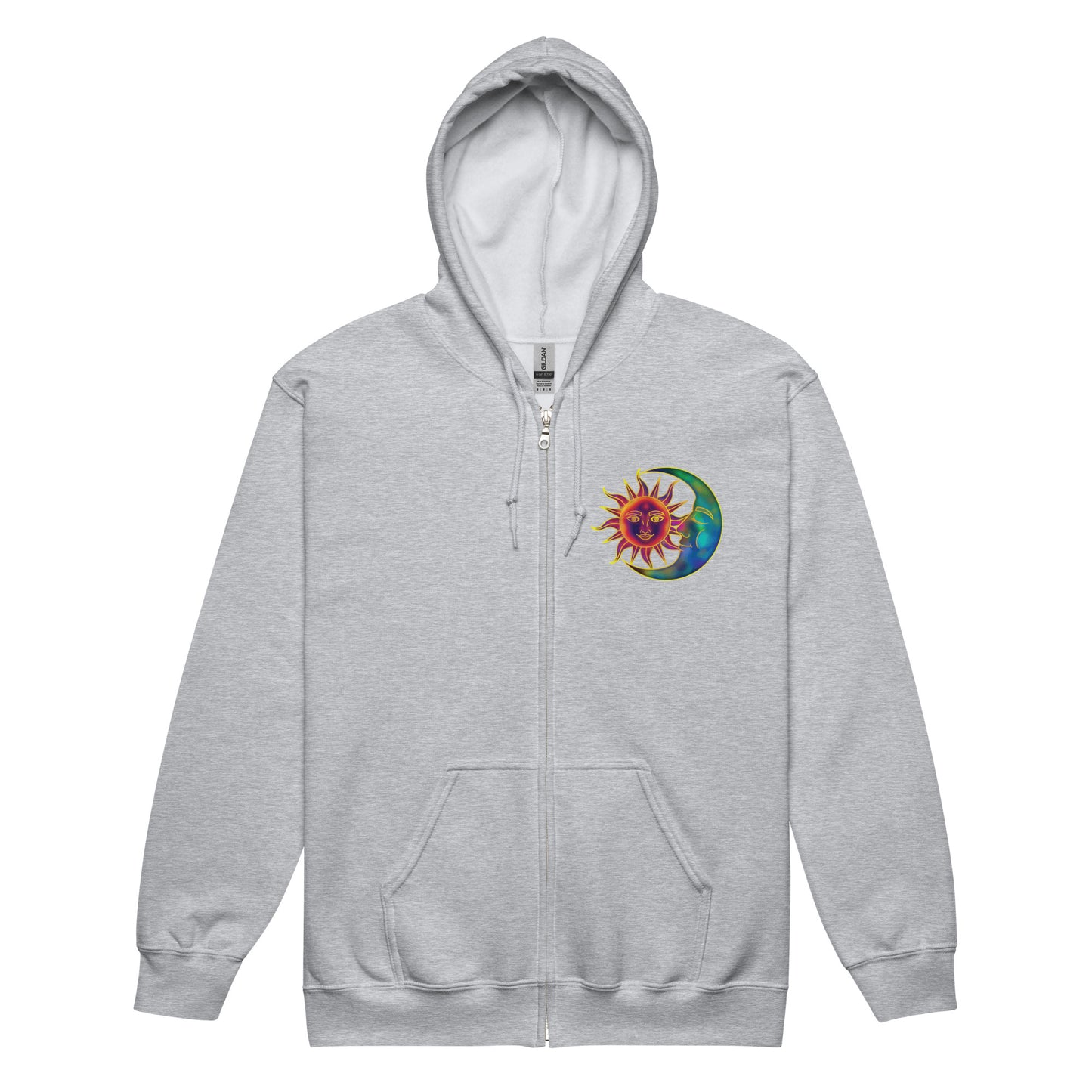 Wrap yourself in cozy celestial charm with this sun and moon zip hoodie, featuring a sweet smiling duo that brings warmth and whimsy to every outing. Made from ultra-soft fleece inside and out, it delivers everyday comfort perfect for nature lovers and starry-eyed dreamers alike. The sturdy metal zipper, roomy pockets, and color-matched drawstrings add practical style to this must-have layer. Whether you're on a peaceful walk or curled up at home, this celestial-inspired hoodie keeps you cozy, and cute.