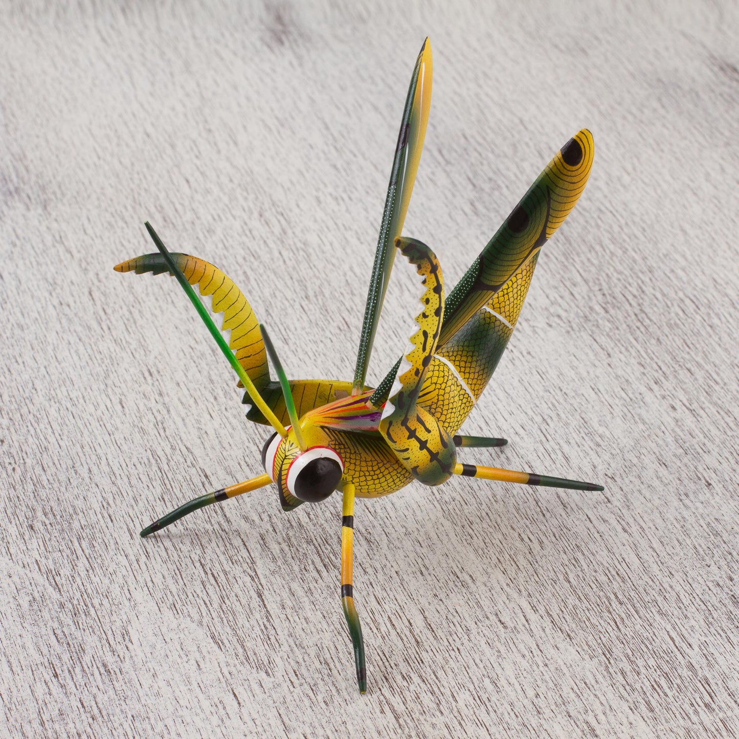 Yellow Good Luck Cricket Wood Alebrije Cricket Sculpture in Yellow from Mexico
